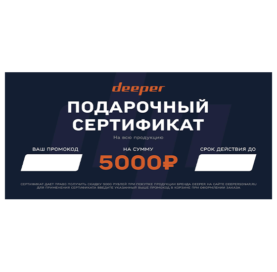 Электронный подарочный сертификат c номиналом 5.000 рублей на всю продукцию бренда Deeper. Для получения сертификата необходимо добавить его в корзину и оплатить банковской картой на нашем сайте. После оплаты вы получите электронный сертификат с индивидуальным промокодом на почту, указанную при оформлении заказа. Для того, чтобы воспользоваться сертификатом, при оформлении заказа в корзине необходимо ввести указанный на сертификате индивидуальный промокод и нажать кнопку "Применить".