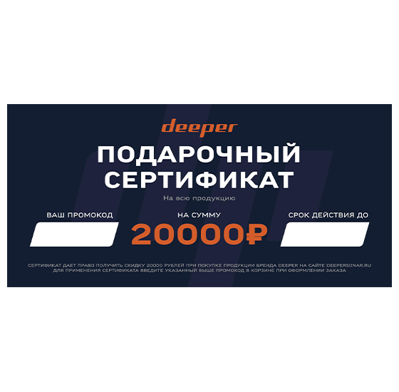 Электронный подарочный сертификат c номиналом 20.000 рублей на всю продукцию бренда Deeper. Для получения сертификата необходимо добавить его в корзину и оплатить банковской картой на нашем сайте. После оплаты вы получите электронный сертификат с индивидуальным промокодом на почту, указанную при оформлении заказа. Для того, чтобы воспользоваться сертификатом, при оформлении заказа в корзине необходимо ввести указанный на сертификате индивидуальный промокод и нажать кнопку "Применить".